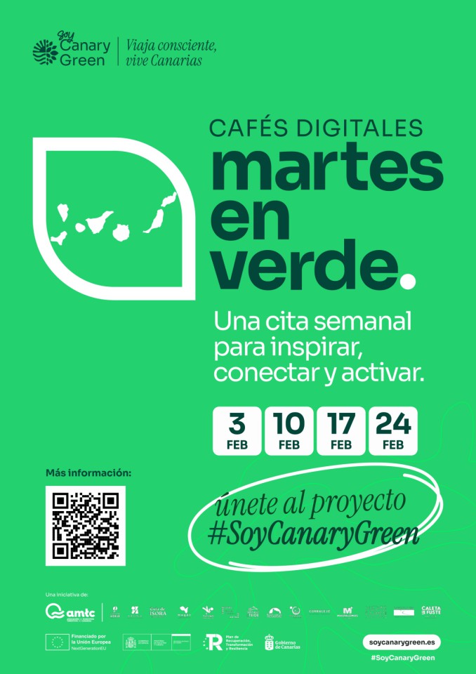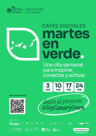 Soy Canary Green lanza este mes de febrero los “Martes en Verde”, un ciclo de cafés digitales participativos y abiertos al público, para conversar, aprender y activar la transición hacia un turismo más sostenible, inteligente y centrado en las personas. Este ciclo forma parte de la estrategia de dinamización del proyecto Soy Canary Green, impulsado por la Asociación de Municipios Turísticos de Canarias (AMTC).