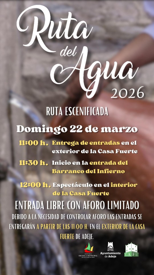 La Ruta del agua 2026 tendrá lugar el 𝐝𝐨𝐦𝐢𝐧𝐠𝐨 𝟐𝟐 𝐝𝐞 𝐦𝐚𝐫𝐳𝐨. Las 𝐞𝐧𝐭𝐫𝐚𝐝𝐚𝐬 son 𝐠𝐫𝐚𝐭𝐮𝐢𝐭𝐚𝐬 hasta completar el aforo y se 𝐞𝐧𝐭𝐫𝐞𝐠𝐚𝐫𝐚́𝐧 el mismo día a las 𝟏𝟏:𝟎𝟎 𝐞𝐧 𝐞𝐥 𝐞𝐱𝐭𝐞𝐫𝐢𝐨𝐫 𝐝𝐞 𝐥𝐚 𝐂𝐚𝐬𝐚 𝐅𝐮𝐞𝐫𝐭𝐞 de Adeje. A las 𝟏𝟏:𝟑𝟎 tendrá comienzo la ruta teatralizada que 𝐚𝐫𝐫𝐚𝐧𝐜𝐚𝐫𝐚́ 𝐞𝐧 𝐥𝐚 𝐞𝐧𝐭𝐫𝐚𝐝𝐚 𝐝𝐞𝐥 𝐁𝐚𝐫𝐫𝐚𝐧𝐜𝐨 𝐝𝐞𝐥 𝐈𝐧𝐟𝐢𝐞𝐫𝐧𝐨; y a las 𝟏𝟐:𝟎𝟎 se 𝐚𝐛𝐫𝐢𝐫𝐚́𝐧 𝐥𝐚𝐬 𝐩𝐮𝐞𝐫𝐭𝐚𝐬 𝐝𝐞 𝐥𝐚 𝐂𝐚𝐬𝐚 𝐅𝐮𝐞𝐫𝐭𝐞 para acoger este espectáculo teatral y musical.