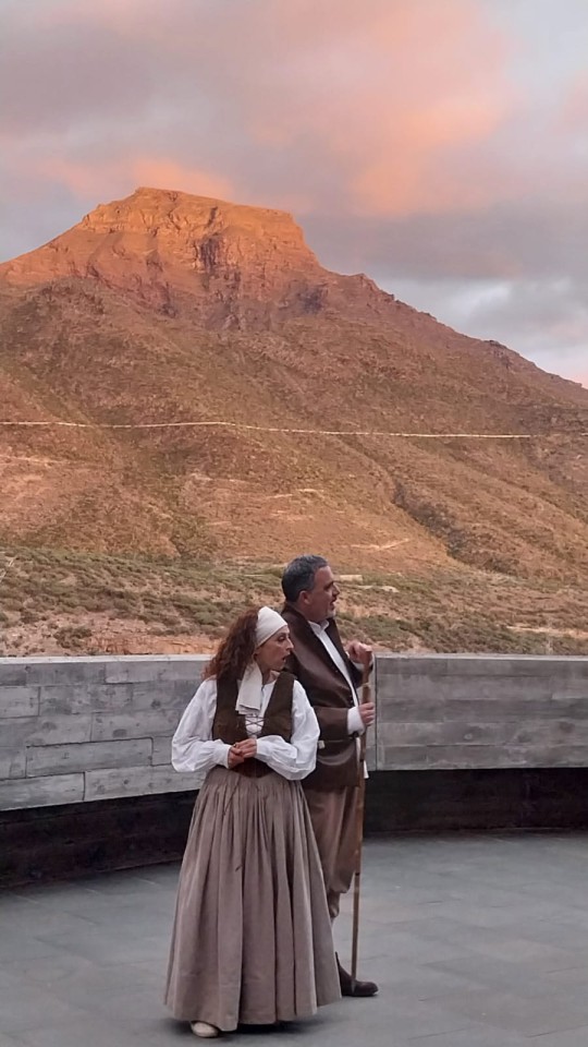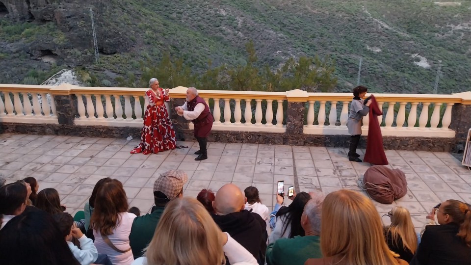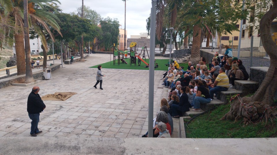 La Feria del Libro de Adeje vivió en la tarde de ayer uno de sus momentos más especiales con la representación de la ruta teatralizada “El zurrón de las macuquinas. La Picota”, a cargo de la compañía Burka Teatro. Cerca de un centenar de personas se dieron cita en la Plaza de España para disfrutar de una propuesta escénica única, en un entorno inmejorable marcado por la caída del sol sobre el Roque del Conde.