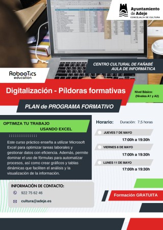 Este curso práctico enseña a utilizar Microsoft Excel para optimizar tareas laborales y gestionar datos con eficiencia. Además, permite dominar el uso de fórmulas para automatizar procesos, así como crear gráficos y tablas dinámicas que faciliten el análisis y la visualización de la información.