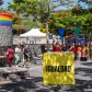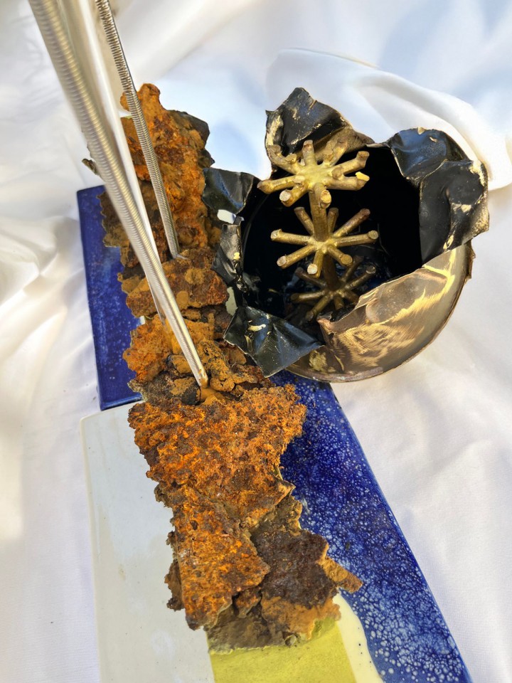 En la base de la obra se encuentra una esfera oxidada, rota y deteriorada, “símbolo de la ultraderecha, de ese odio anclado en el pasado que intenta oprimir y negar los derechos del colectivo. Es una fuerza que, pese a su agresividad, aparece vencida por el tiempo y el desgaste moral. Pero desde esa base quebrada surge con fuerza una estructura vertical, símbolo de la libertad y del avance. Esa verticalidad encarna la lucha por los derechos, por la visibilidad, por una sociedad más justa. Se alza luminosa, como un gesto de esperanza que atraviesa la sombra” explicó el artista.