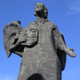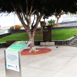 Porta en la mano izquierda el escudo de Adeje. Mensajeros ángeles de la guarda, son aquellos que según la angelología cristiana tienen como misión ayudar al ser humano a acercarse a Diós, bajando a la tierra en forma de espíritu.