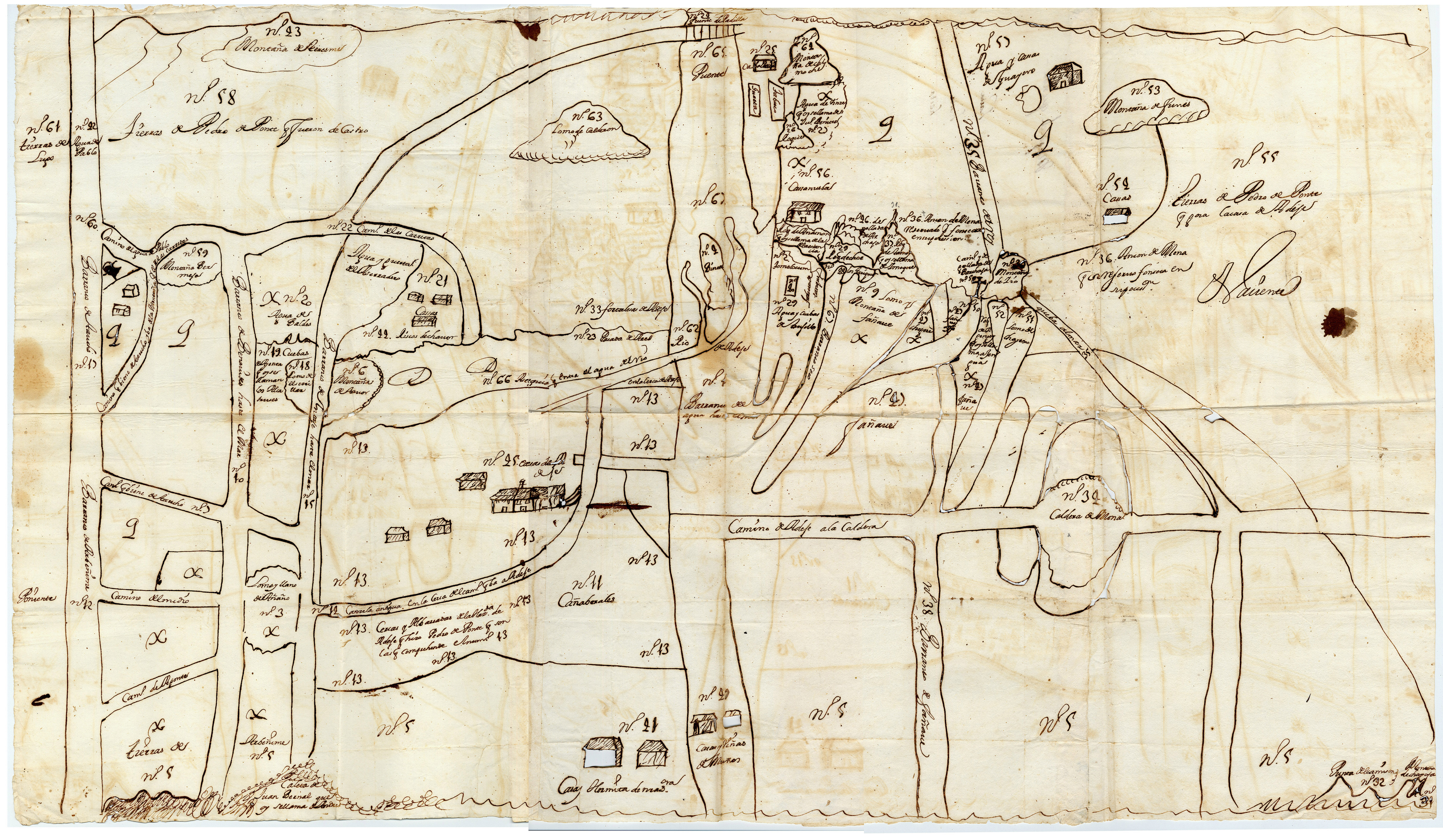 Este plano es de gran interés, porque en él vemos los distintos predios de la Casa Fuerte, terrenos que hoy en día dan nombre a barrios tan populares como Los Olivos, La Postura, La Viña o El Galeón.