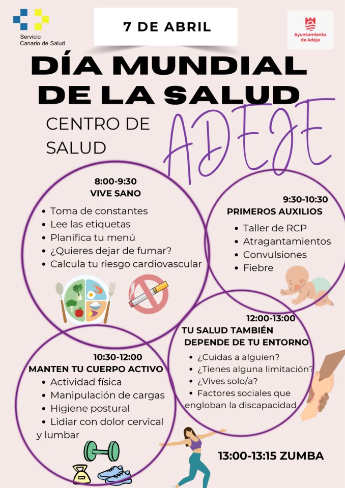El Ayuntamiento de Adeje y el Centro de Salud de Adeje invitan a toda la ciudadanía a participar en los actos conmemorativos del Día Mundial de la Salud, una jornada dedicada a promover el bienestar, la prevención y los hábitos de vida saludable.